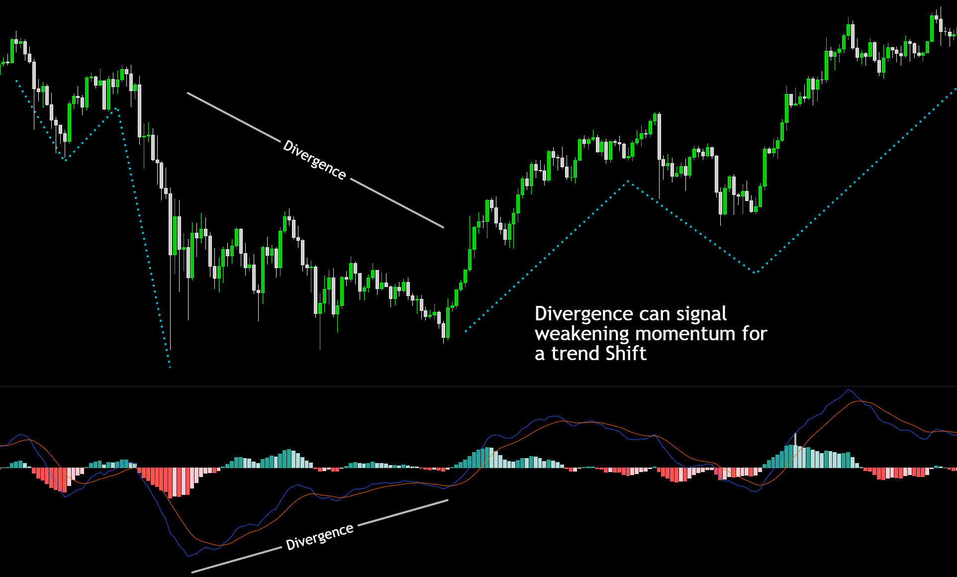 Divergence, where price keeps pushing but MACD does not, can hint that momentum is fading.