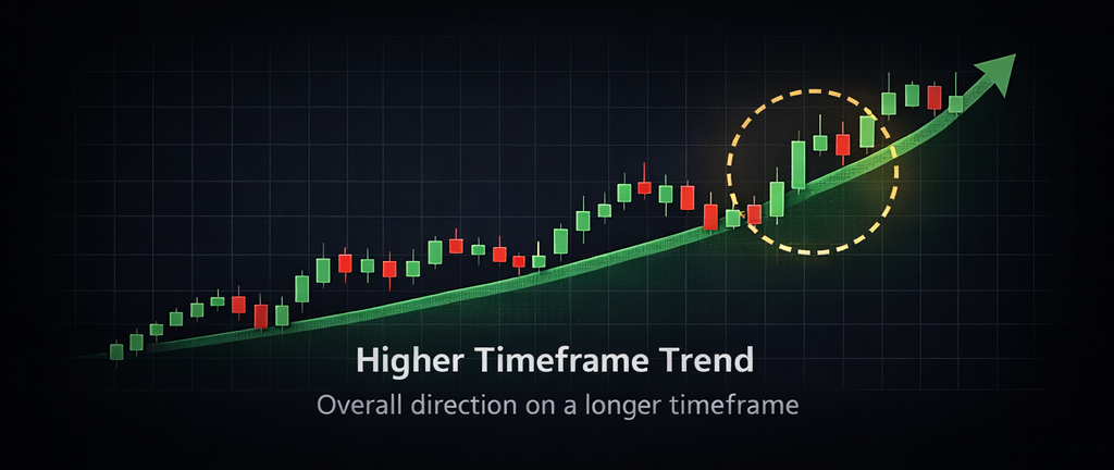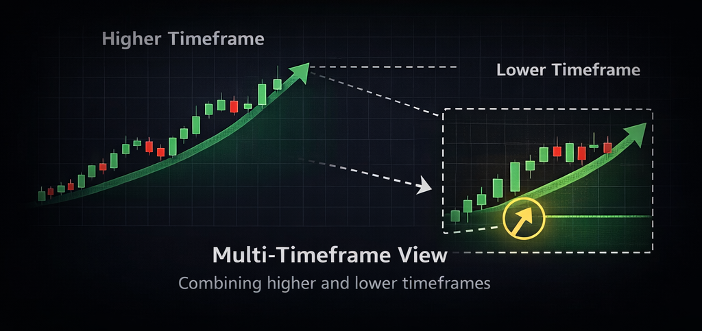 A timeframe is the “zoom level” of your chart (Daily, 4H, 1H, 15m, etc.).